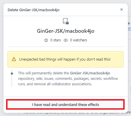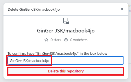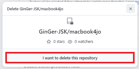 ▲ 삭제하려는 레포지토리 이름을 입력한다.