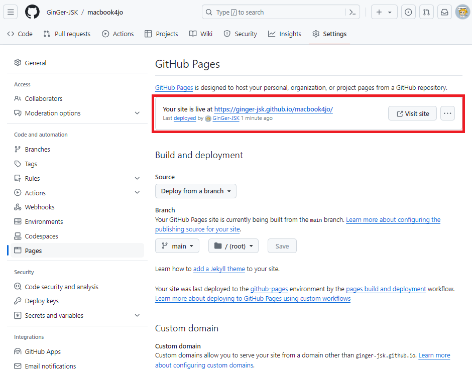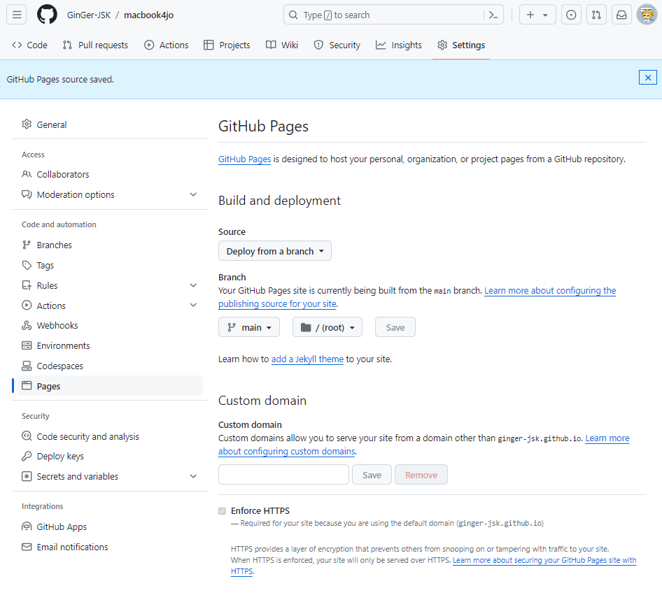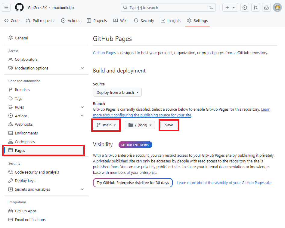 ▲ 좌측 메뉴에서 Pages 를 클릭, 브랜치는 main 클릭, Save 클릭