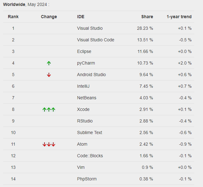 VS, VSCode 가 최상위권을 점유하고 있고, 계속 상승세를 타고 있다.