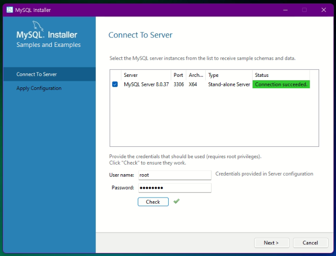 설치 과정에서 입력한 root 비밀번호를 입력 후, Check 클릭, 확인되면 Next 클릭