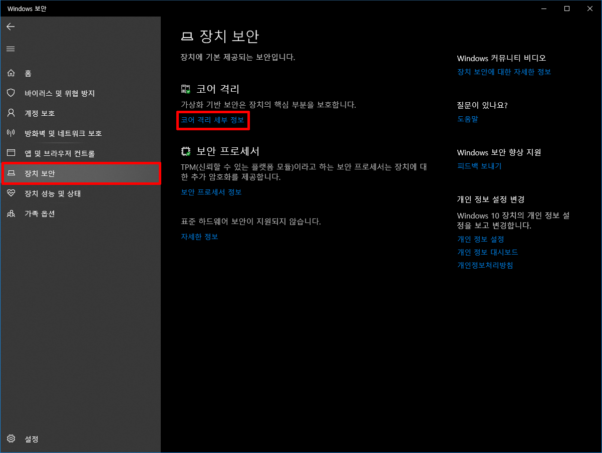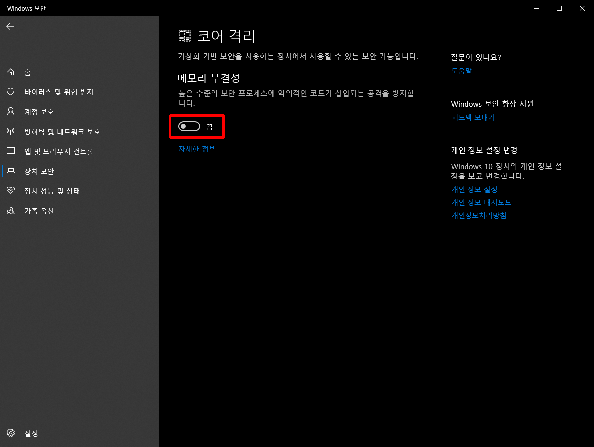 이제 메모리 무결성을 켜는 방법을 확인해봅시다.