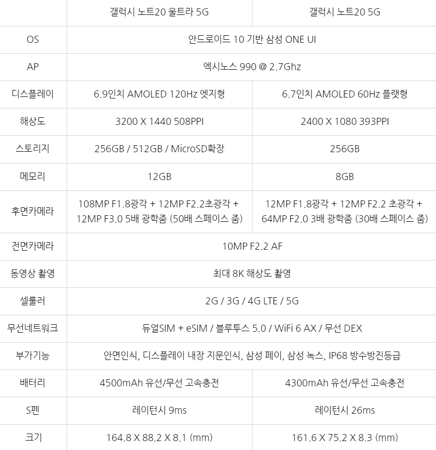 또한 노트20 라인에서 노트20 / 노트20 울트라는 완전히 다른 기기라고 봐도 무방할 정도로 너프가 심합니다.