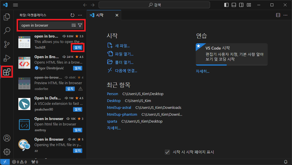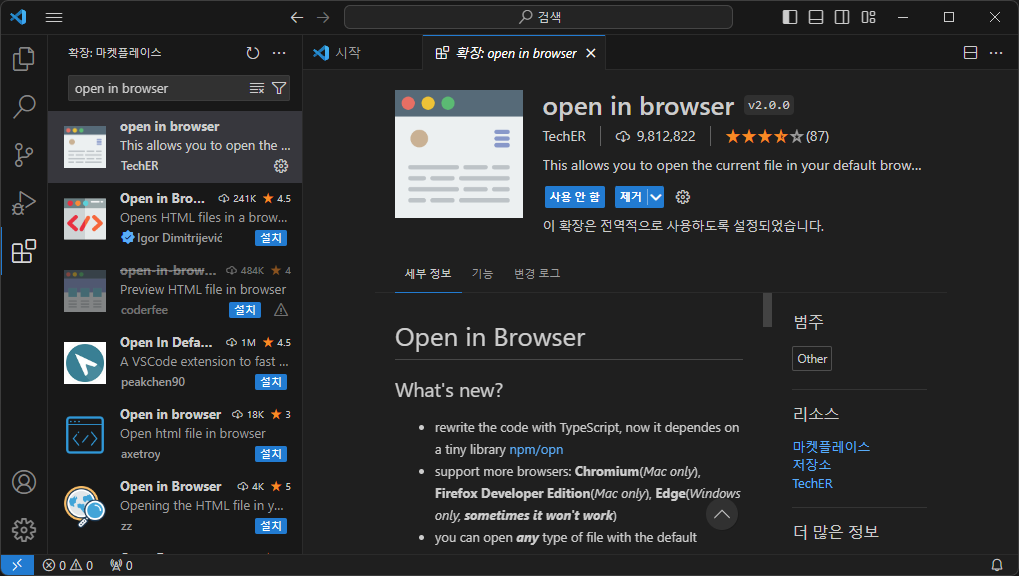▲ 다시 확장 프로그램 탭으로 가서, open in browser 를 검색 후, 최상단에 표시되는 확장 프로그램을 설치 해준다.