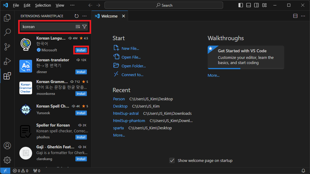 ▲ 검색창에 korean 을 입력 후, 최상단에 표시되는 지구본을 찾은다음, install 을 눌러 설치한다.