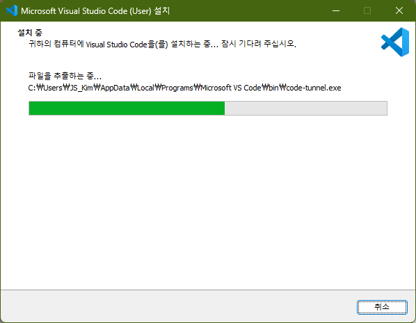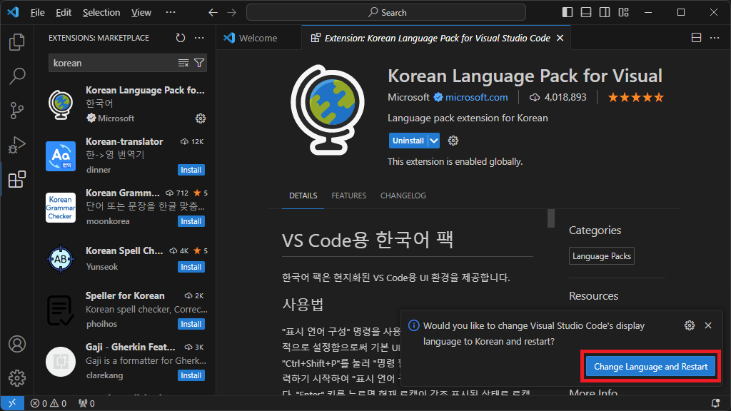 ▲ 설치가 완료되면 언어 변경을 위해 VS Code 프로그램을 재시작 한다는 팝업이 나타난다, 클릭.