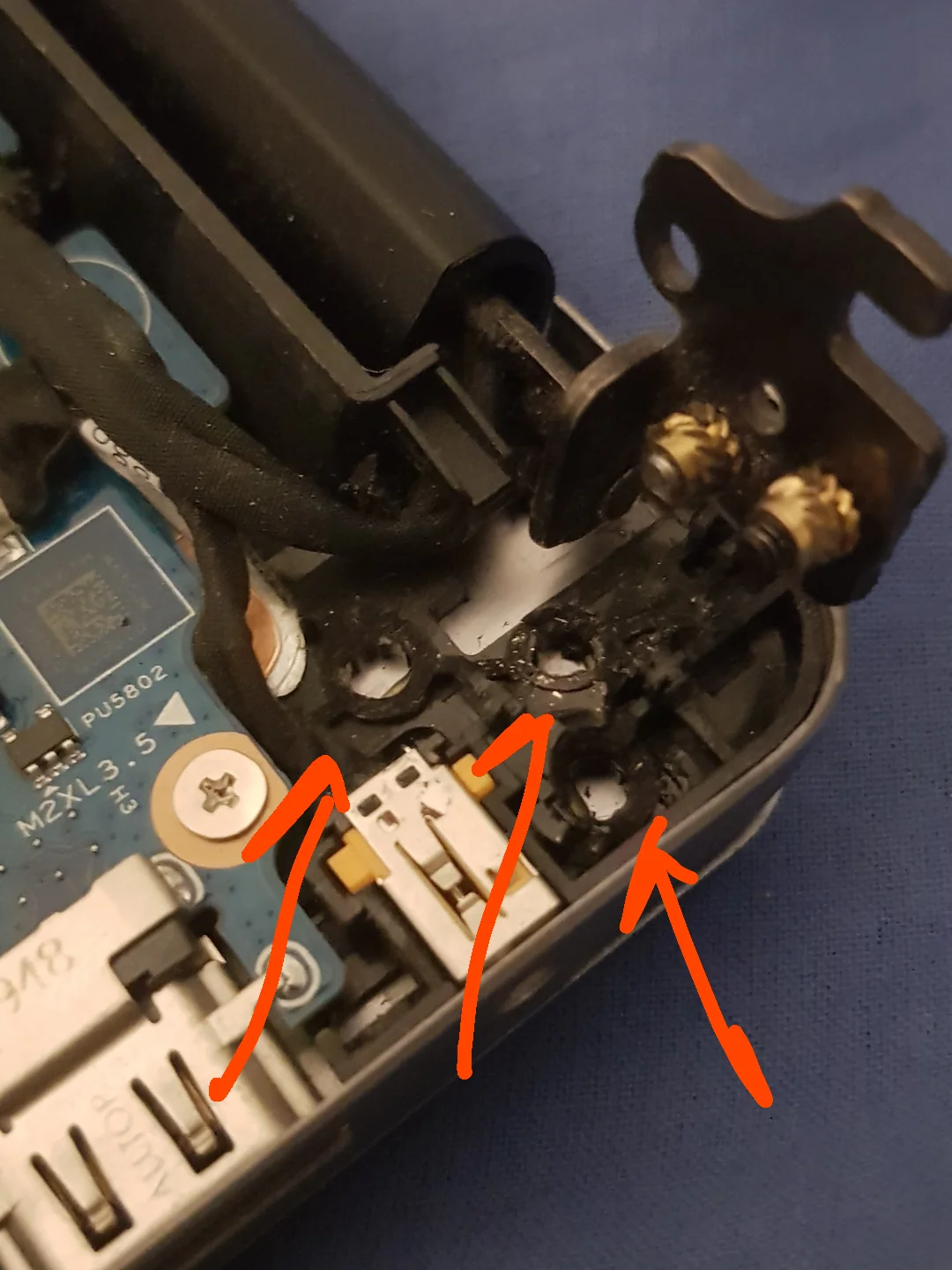이렇게 단단한 부품을 플라스틱으로 구성된 노트북 프레임에 고정하여, 지렛대의 원리를 사용하여 모니터를 열고 닫는과정에서 플라스틱에 지속적인 부하가 가해지며 부러지거나 바스라지고 고성능 노트북의 경우 발열때문에 부서지는게 더 가속화 됩니다.