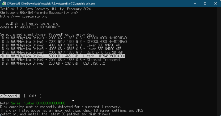 ▲ 그럼 위와같이 엄청나게 어렵고 뭔가 무서워보이는 화면이 나타나는데 겁먹지 마시고, 문제가 생긴 디스크(USB메모리나 SD카드 또는 외장하드)를 선택하고 Proceed 를 엔터눌러줍니다.