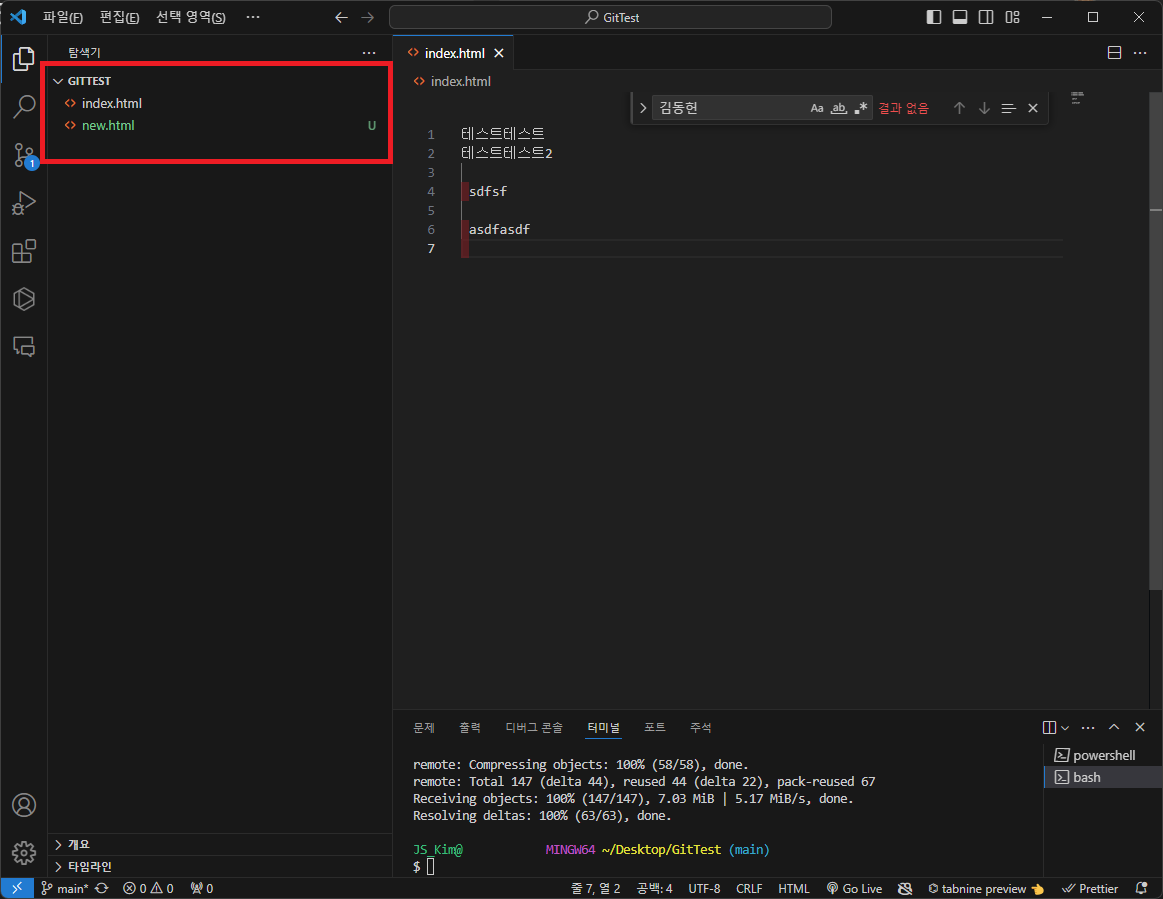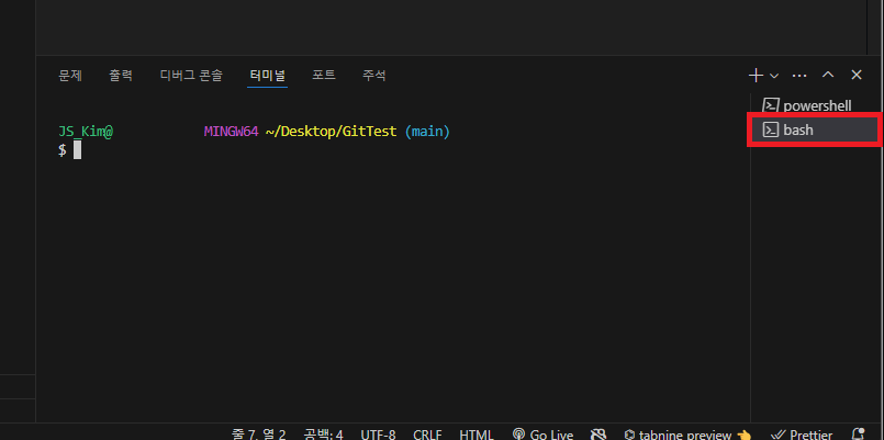터미널과 Git Bash 를 혼동하지 말자, Git 관련된 명령어는 Git Bash창에서 수행한다.