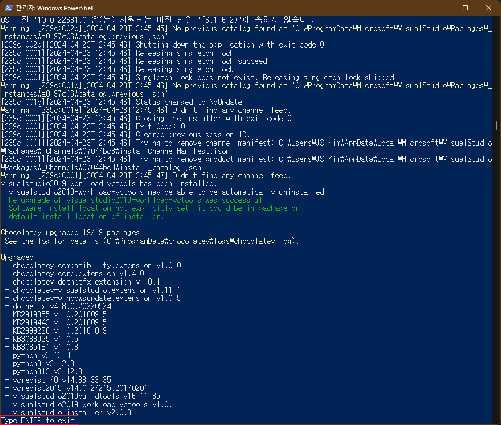 ▲ 추가도구 설치가 완료된 후, Type ENTER to exit: 라는 문구가 나타납니다. 키보드의 ENTER 키를 눌러 설치를 종료합니다.