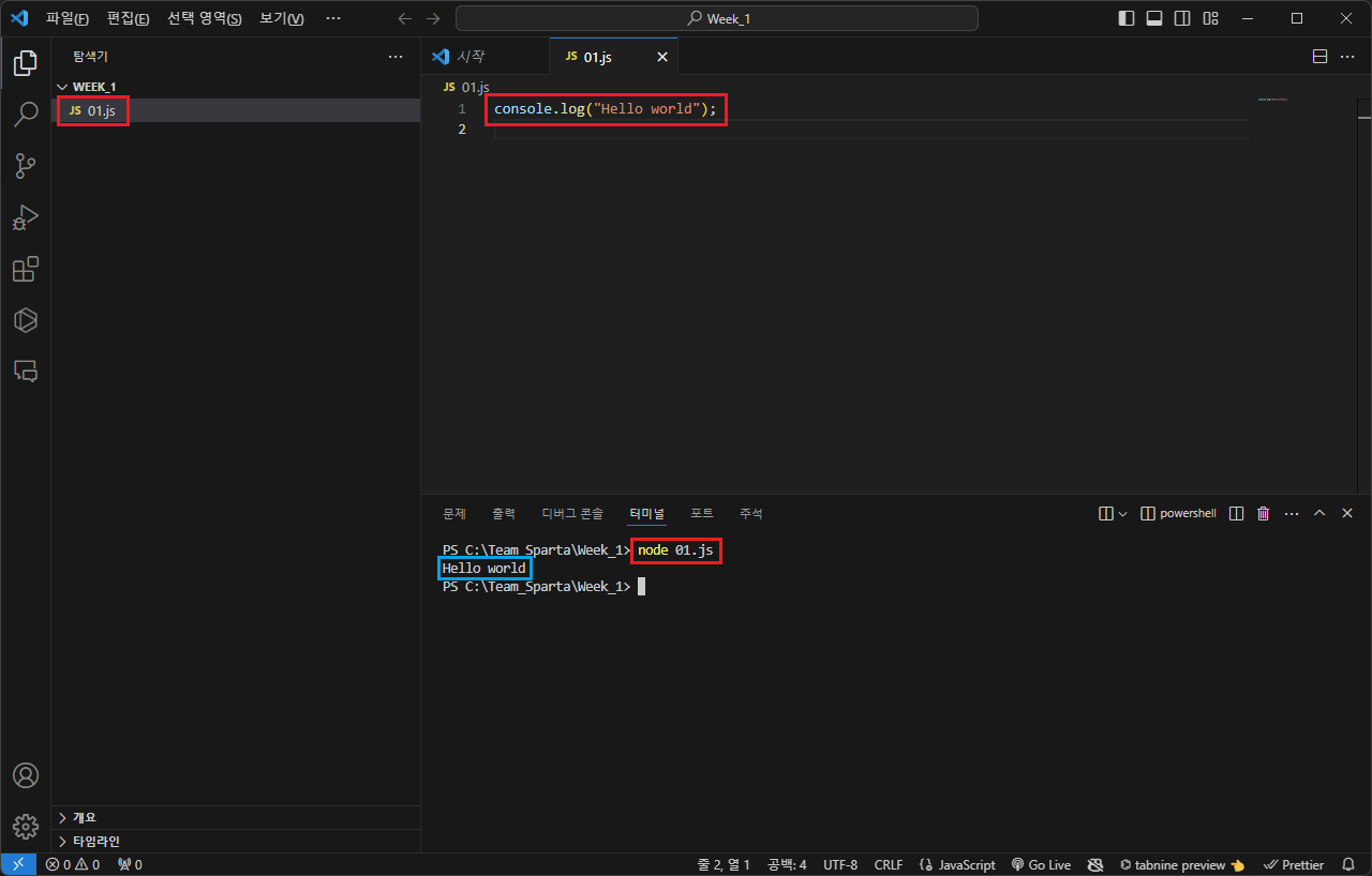 새로운 파일을 만들어 01.js로 이름을 지정한 후 아래의 명령어를 입력합니다.