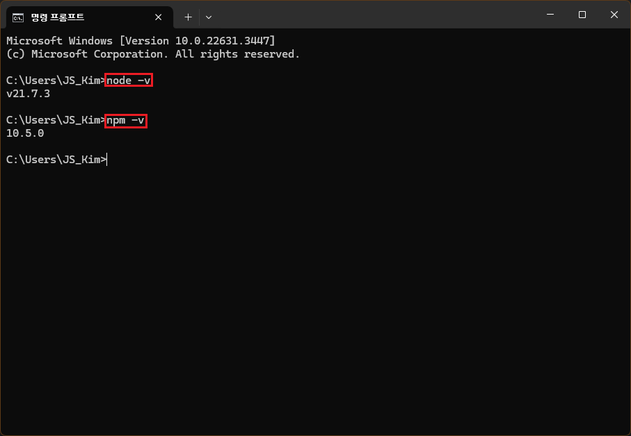 입력하면 현재 설치된 node의 버전과 npm의 버전이 표시됩니다.