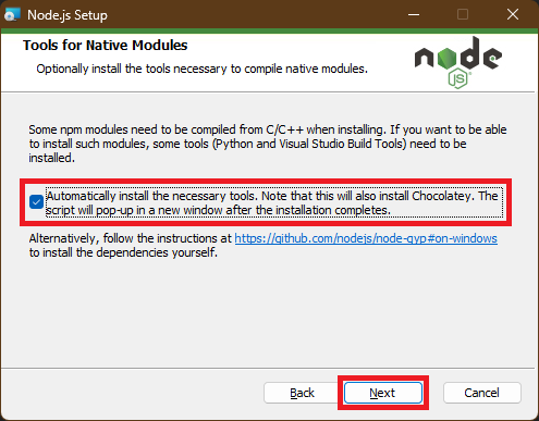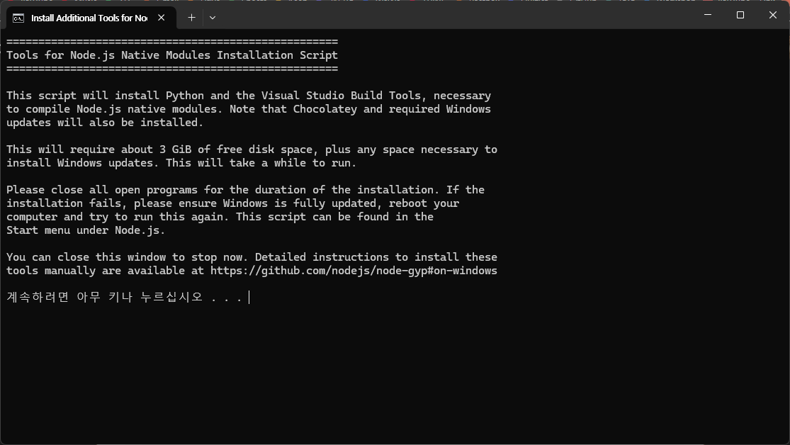 ▲ Node.js 설치가 끝나면 추가도구 설치화면이 나타납니다. 키보드의 아무키나 눌러 다음 단계로 이동합니다.
