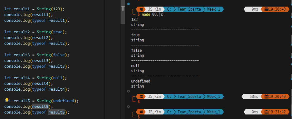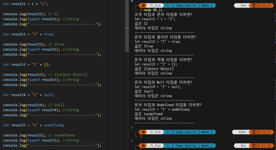 문자열 1과 불리언 true를 더하고 출력을 하자, 문자열로 변환하여 1true 라는 문자가 출력되었다.