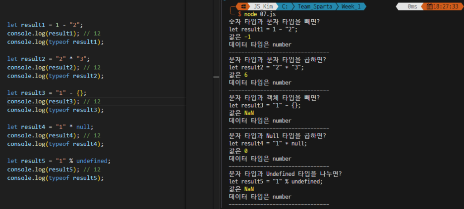 숫자 1과 문자열 2를 빼고 출력을 하자, 문자를 숫자로 변환하여 -1 이라는 숫자가 출력되었다.