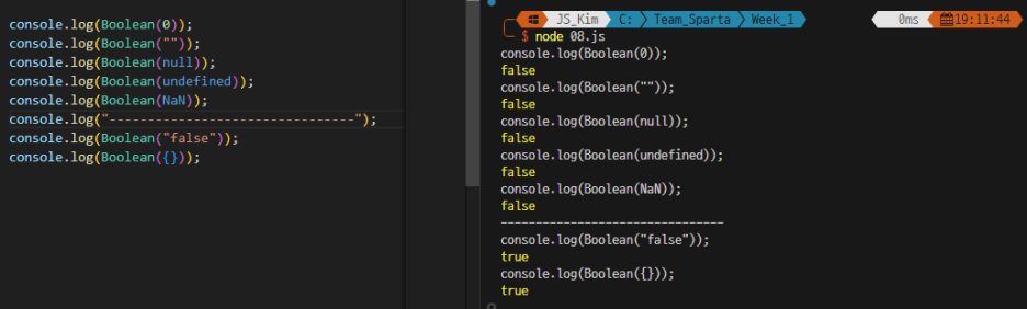 false 를 넣고 출력을 하자, 숫자로 변환되어 0 이 출력되었다.
