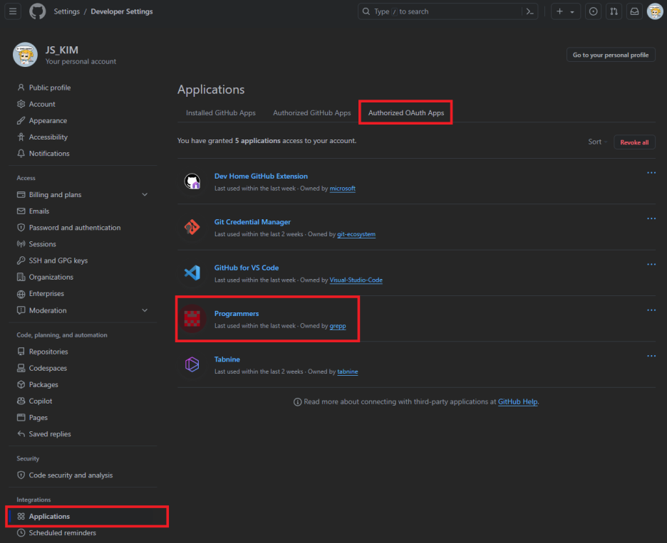 ▲ GitHub 에 접속하여 인터그레이션 > 어플리케이션에 가보면 지금까지 권한을 부여한 어플리케이션들이 보인다.
