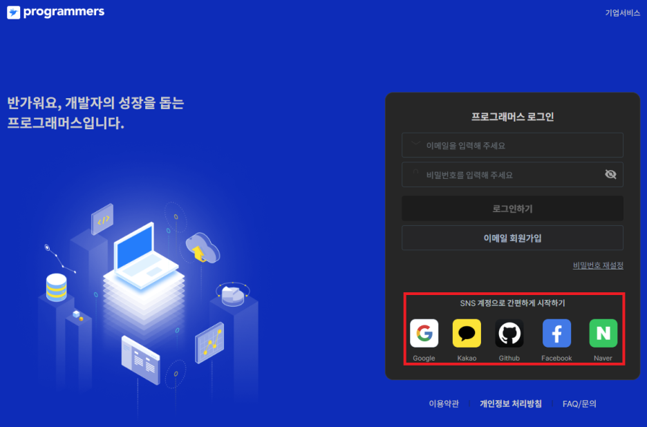 ▲ 프로그래머스 홈페이지에 직접 회원가입이 가능하고, 다른 앱 처럼 소셜로그인도 지원한다.